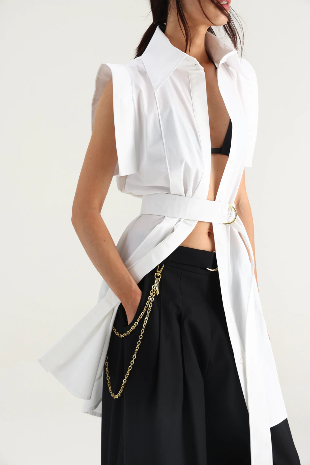 Esta camisa larga blanca se destaca por sus geometrías marcadas en los hombros, que aportan una estructura moderna y elegante. Su maxi cuello entretelado y botones tapados le confieren un acabado impecable y delicado.