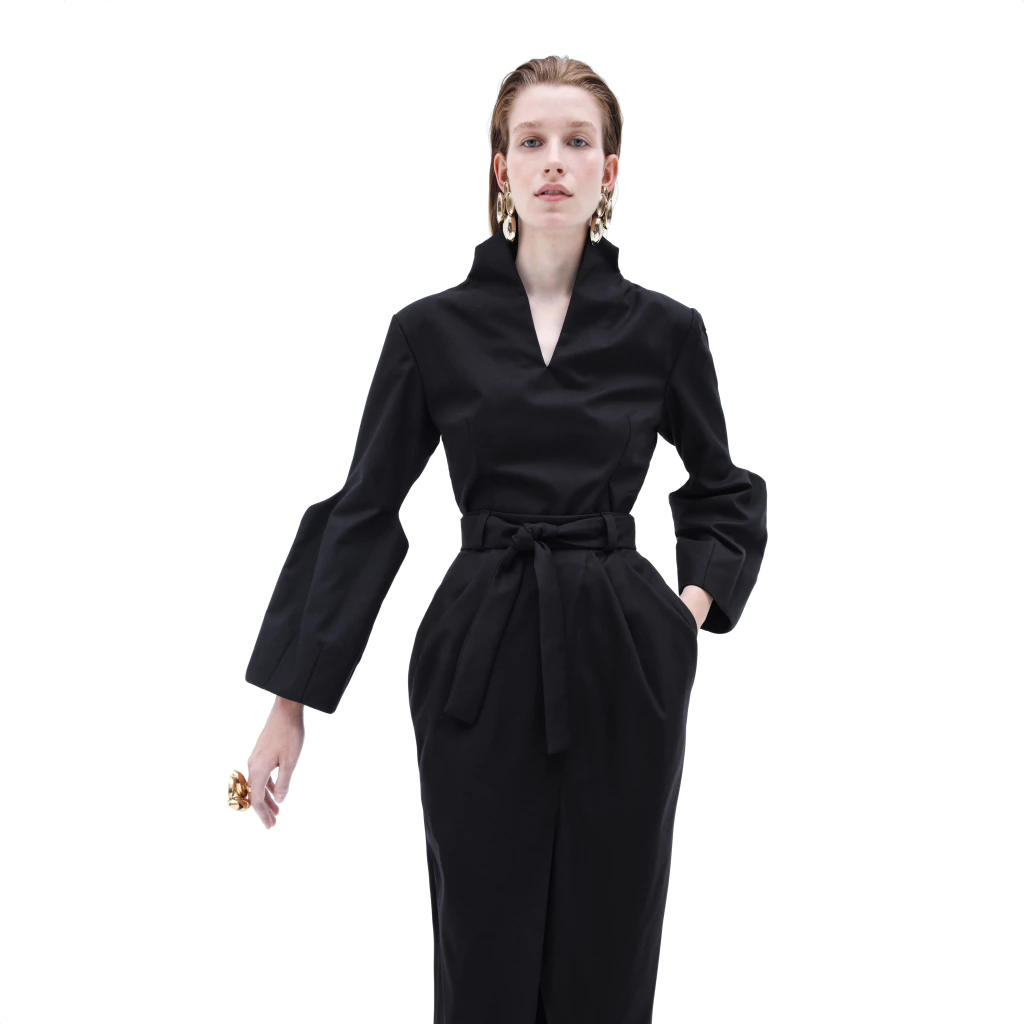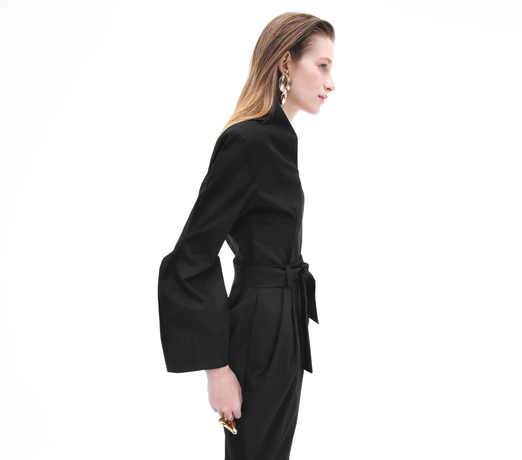 Jubón con cuello geometrico remarcado y escote en V. Mangas con forma geometrica, con salientes y pinzas que la convierten en una pieza con una opulencia organica sutil, sobria y elegante. Género sarga sastrera. Envivada en interiores. Realizadas una a una, artesanalmente. Edición limitada.