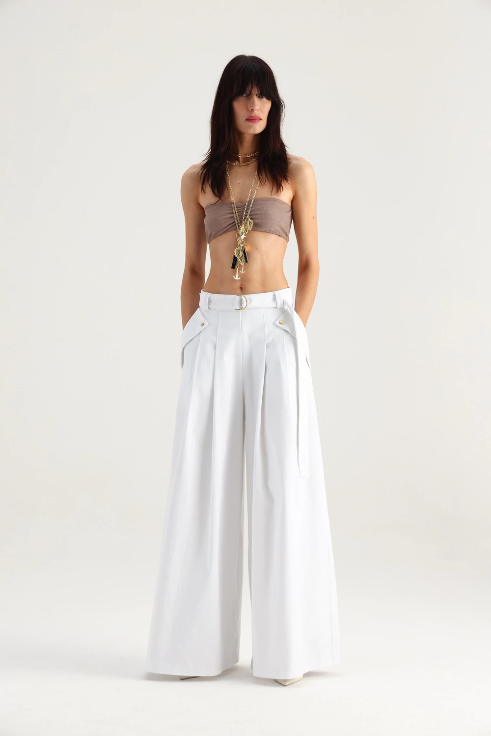 Pantalón sastrero de tiro alto con pierna súper ancha. Este pantalón se destaca por un importante recurso de diseño en sus bolsillos delanteros con tapas geométricas más dos botones metálicos de pie ornamentales, en tono dorado, que aportan un toque de distinción y singularidad.